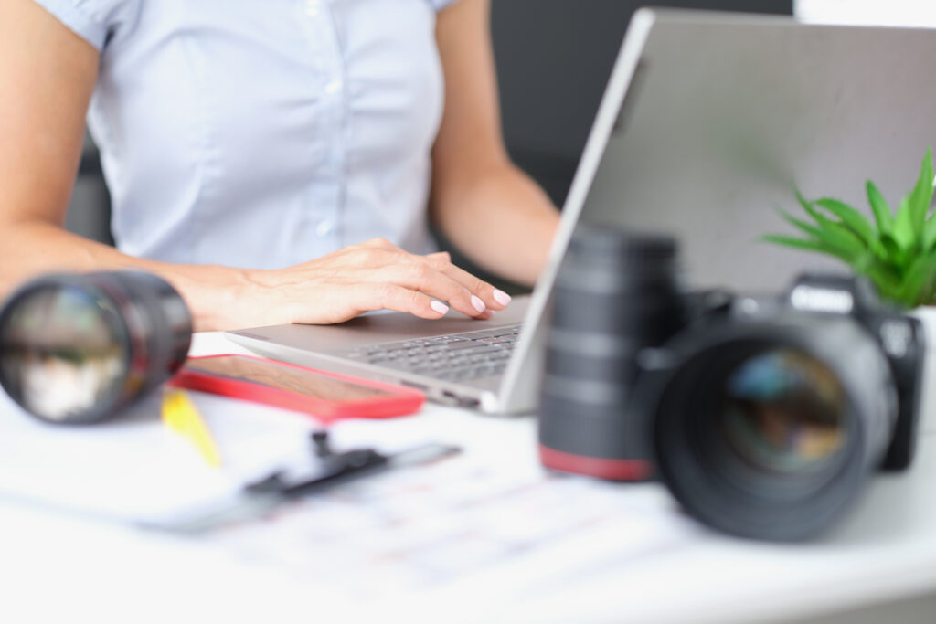 Woman typing on laptop keyboard at table with camera lenses closeup. Content creation concept
