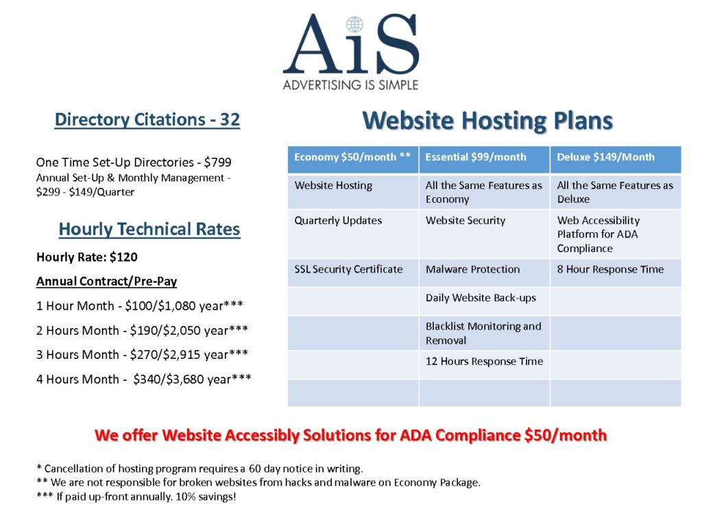 Website Updates Directories and Hosting for Advertising is Simple located in Delaware. We offer Web Design, Web Hosting and Web accessibly solutions to businesses and organizations located on the east coast.